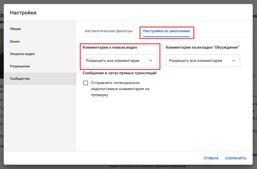 2) Через новый интерфейсе YouTube — зайдите в Творческую студию — Настройки канала — и перейдите в раздел Сообщество. Далее все по той же схеме — определите, не отключены ли комментарии и выберите, все ли сразу показывать и в каком порядке.
