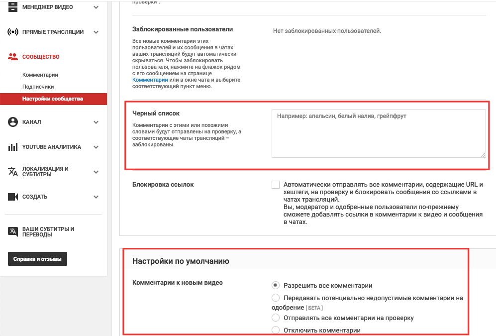 Также в этом разделе можно можно заблокировать определенные аккаунты, настроить модерацию комментариев и добавить в черный список оскорбительные слова, также выбрать одно правило для всех комментариев на канале.
