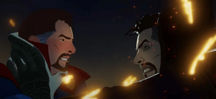 Вишенкой на торте во второй сцене можно назвать появление тёмного Доктора Стрэнджа. Это каноническая версия мага, которую в том числе показали в одной из серий мультфильма «Что, если…?».