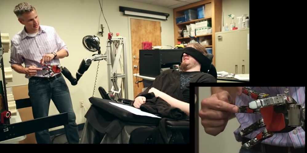 Демонстрация эксперимента с нейроинтерфейсом, где парализованный человек смог почувствовать прикосновение к механической руке
