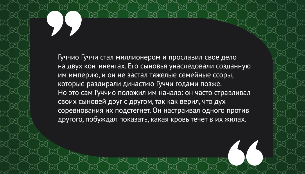 После смерти Гуччио в 1953 году акции бизнеса были переданы его трем сыновьям: Васко, Родольфо и Альдо. Альдо, как старший брат, взял на себя главную роль в управлении компанией и привел ее к процветанию. В 1960-70-х Gucci стал брендом звезд, узнаваемой маркой, ассоциирующейся с успехом, гламуром и исключительной роскошью. Однако в 1980-х все изменилось, Альдо постарел, следующее поколение Гуччи уже не считалось с его мнением и имело собственные взгляды на ведение бизнеса.