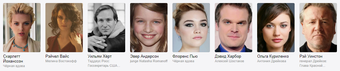 - Флоренс Пью — агент Елена Белова, предположительно преемница Наташи по киновселенной Marvel;