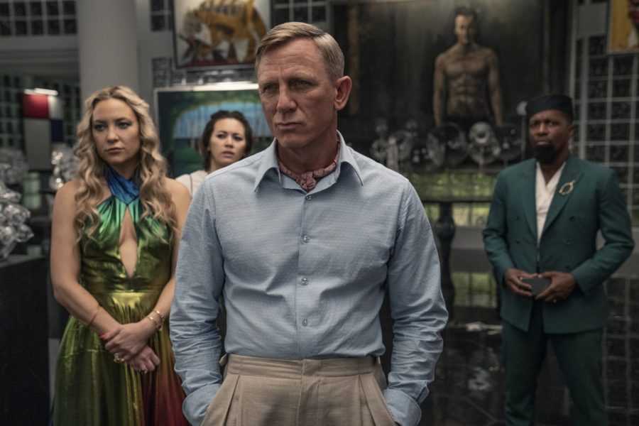 Кейт Хадсон в роли Берди Джей, Дэниэл Крэйг в роли Бенуа Блана, Лесли Одом мл. в роли Лионеля Туссэна и Джессика Хенвик в роли Пэг в фильме «Достать ножи: Стеклянная луковица / Glass Onion: A Knives Out Mystery» (2022)