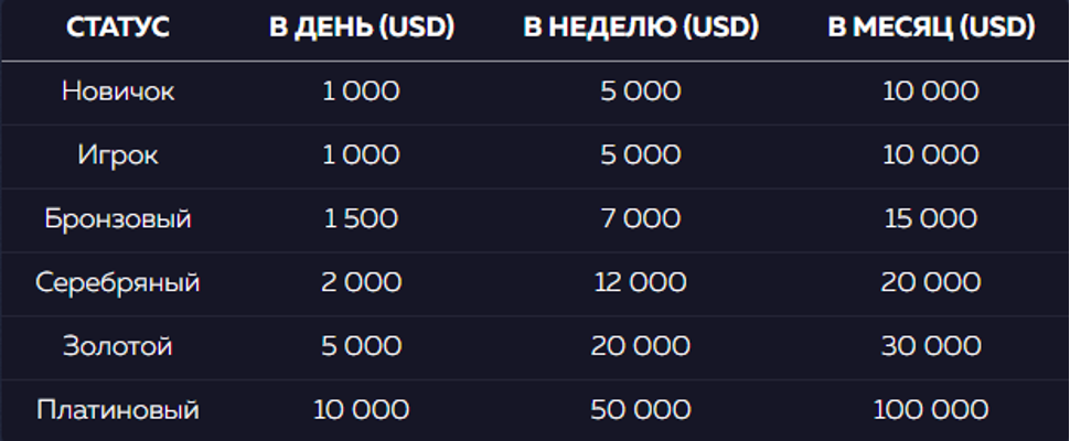 Сумма минимального депозита варьируется от 50 до 6000 рублей, в зависимости от выбранного способа. Все те же платежные методы можно использовать и для вывода средств. Указывать в заявке можно от 1000 рублей. Выводы производятся в тот же день в течение нескольких часов. Для вывода средств обязательная верификация не нужна, она понадобится только в исключительных случаях. Лимиты на вывод зависят от вашего текущего статуса: