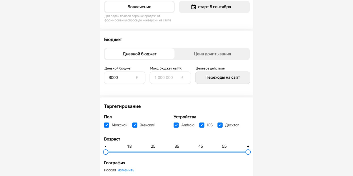 Остались только самые базовые настройки таргета – пол, возраст, страна и тип гаджета