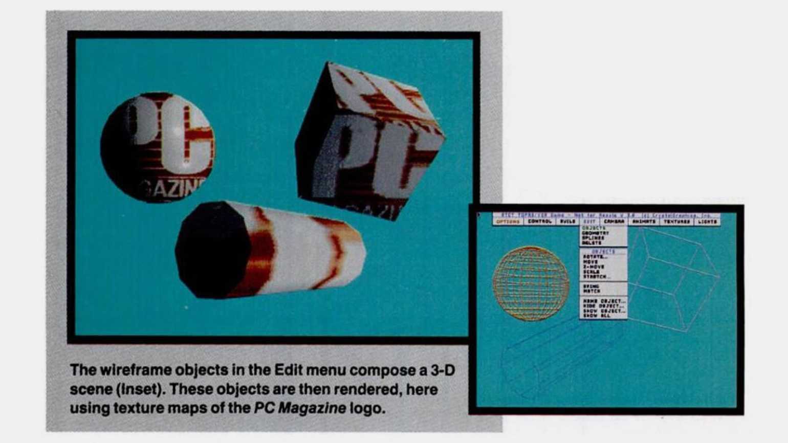 Журнал PC Magazine — выпуск 16 апреля 1991 года. Подпись под картинкой: 3D-сцена в окне Edit состоит из моделей будущих объектов. В данном случае упомянутые объекты уже отрендерены с использованием текстуры, для которой мы выбрали логотип PC MagazineИзображение: PCMag /