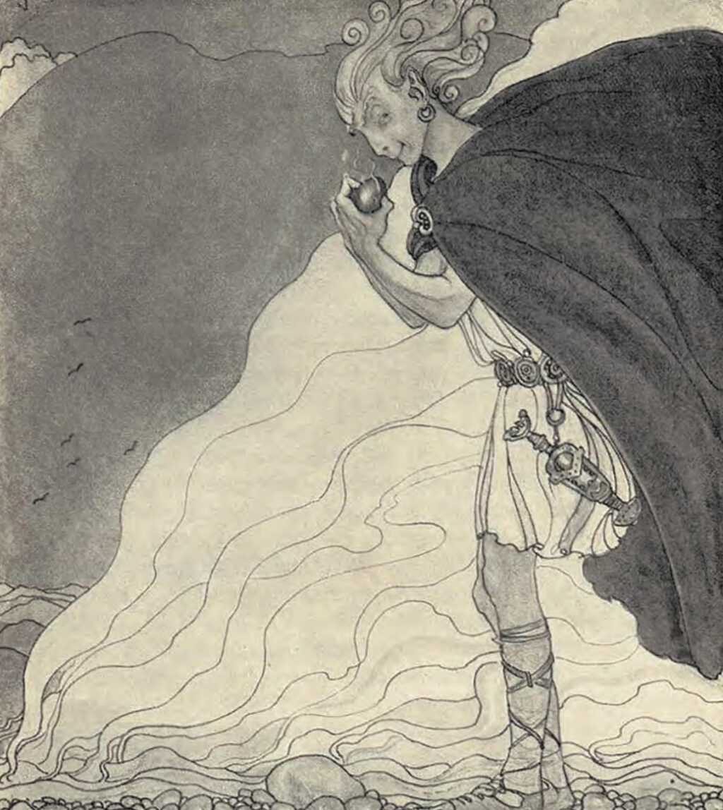 Локи попросил дать ему минуту и, воспользовавшись шансом, выпрыгнул в окно и полетел в своих волшебных ботинках по небу над морями. В тот самый миг, когда Локи решил, что избавился от смертельной опасности, он услышал у самого уха гулкий голос Тора: «Здравствуй, Локи! Как тебе здешний воздух? Пошли же домой, исполним обещанное тобой». Он подтолкнул Локи в спину своим новым молотом. «Но… но я же вернул волосы Сиф, — бормотал Локи, — и ты получил молот по уговору! Такова твоя благодарность? Все вы, боги, одинаковые!»