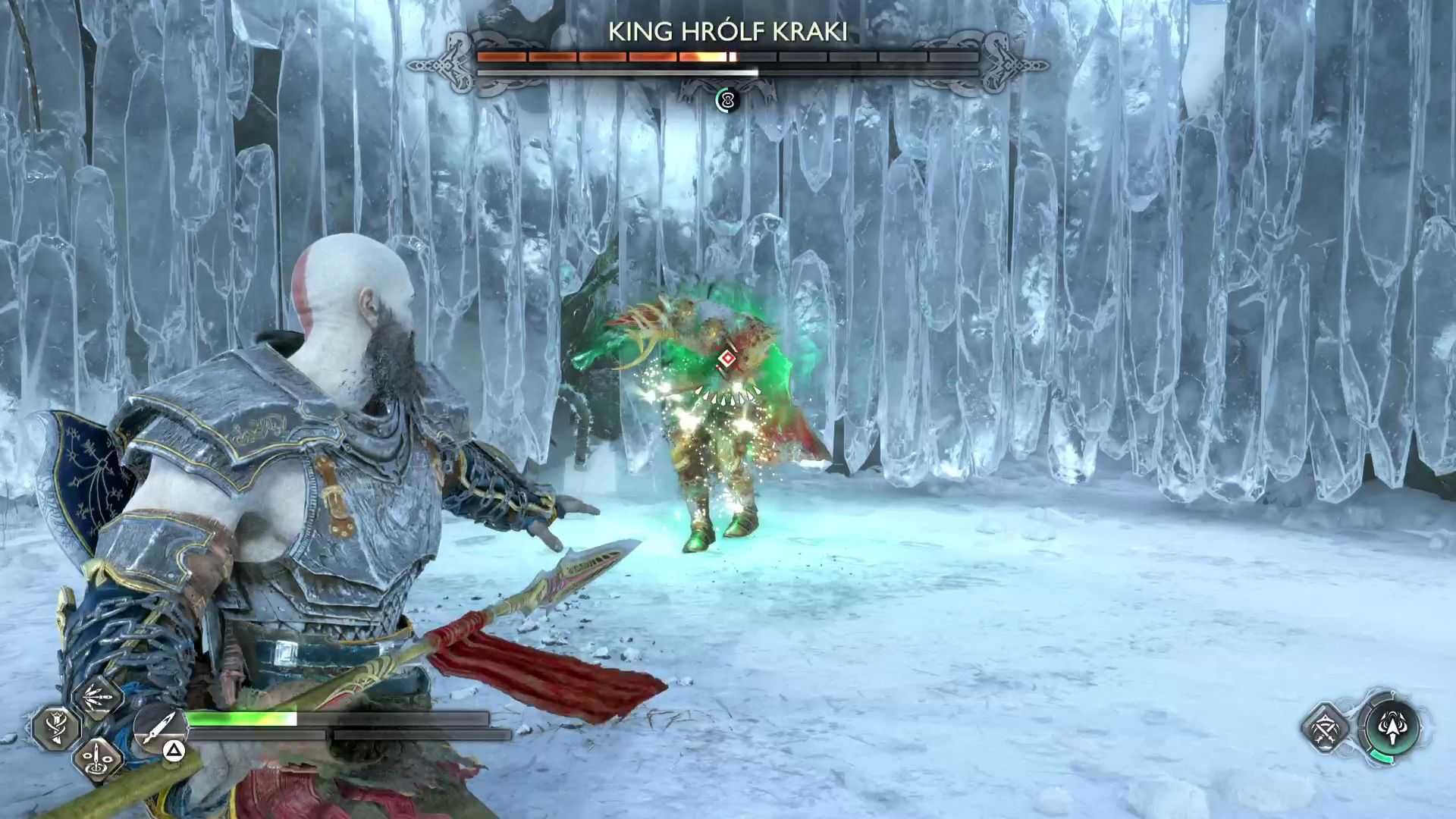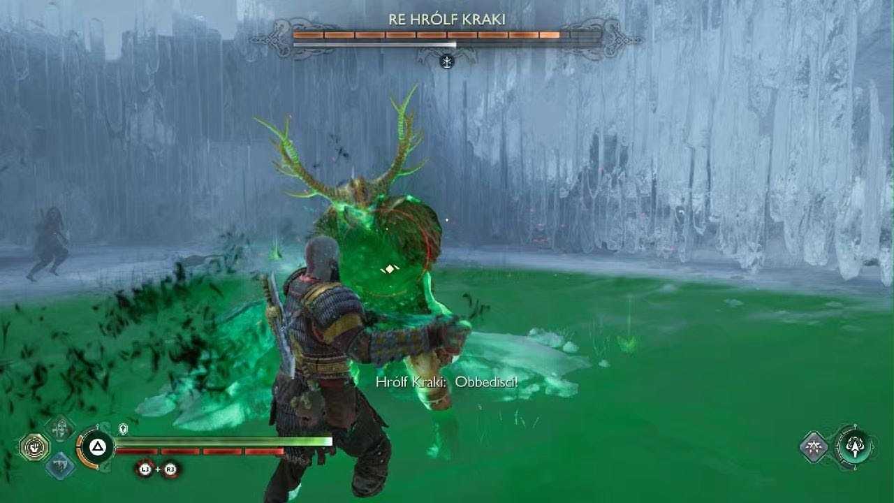 У короля Хрольфа Краки есть несколько атак, которые заставляют его парить в воздухе. У двух он летит прямо к Кратосу, и от него достаточно легко откатиться. Еще одна атака оставит его неподвижным в воздухе, когда он атакует стихиями в красных кругах, где бы ни был Кратос. Это еще один случай отката от атак до тех пор, пока они не закончатся