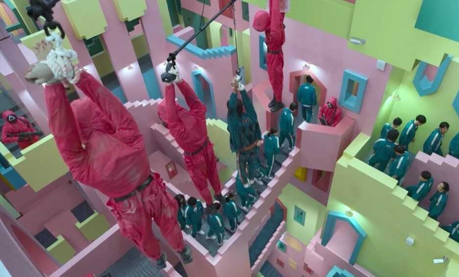 Как видно по кадрам сериала, на огромной территории «Игры» есть люди только двух типов — участники и охранники. Первые носят синие спортивные костюмы, а вторые облачены в красно-розовые брюки и балахоны с масками, закрывающими лица.
