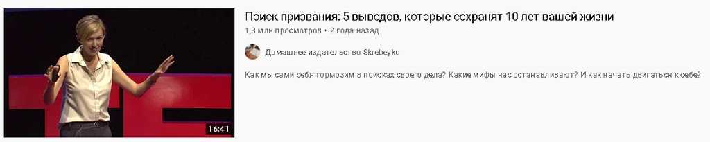 Платформа выдает первые 100-150 символов из описания видео в поисковых запросах. Создатель контента должен в этих двух-трех предложениях простым языком отразить суть ролика так, чтобы зритель выбрал именно его из первой двадцатки поисковой выдачи.