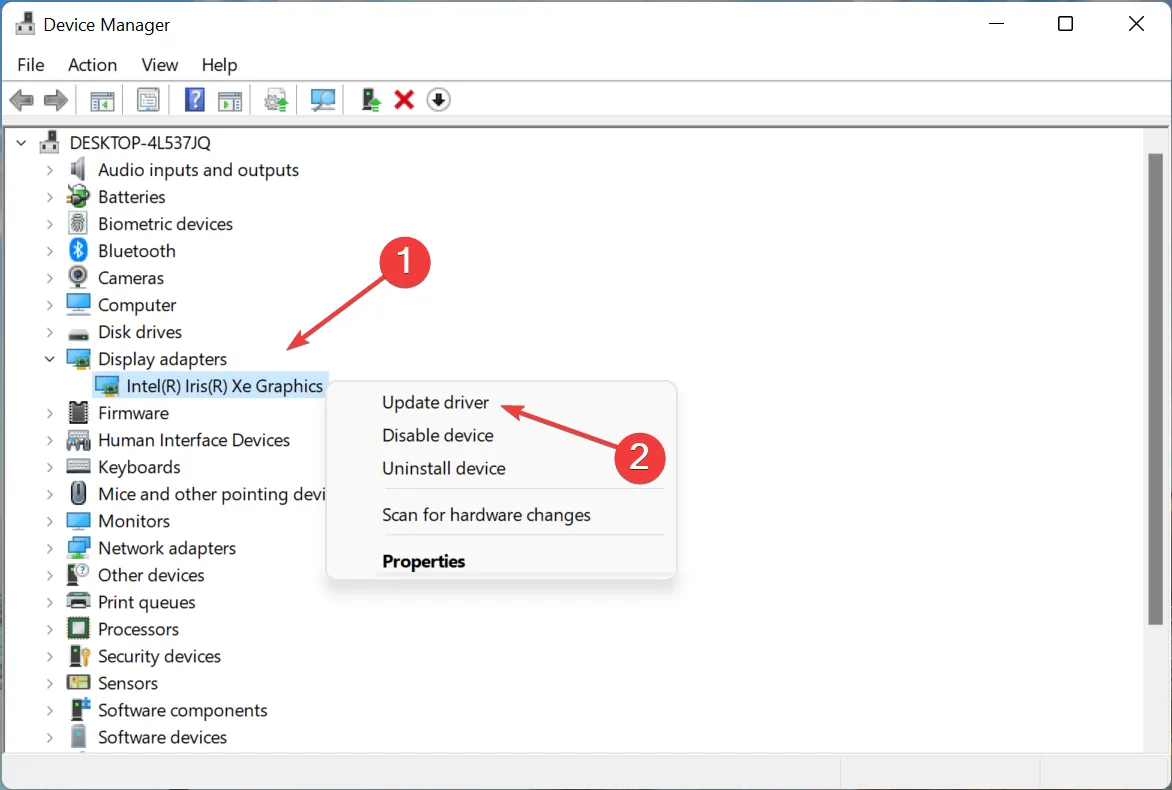 Щелкните правой кнопкой мыши графический адаптер и выберите «Обновить драйвер».