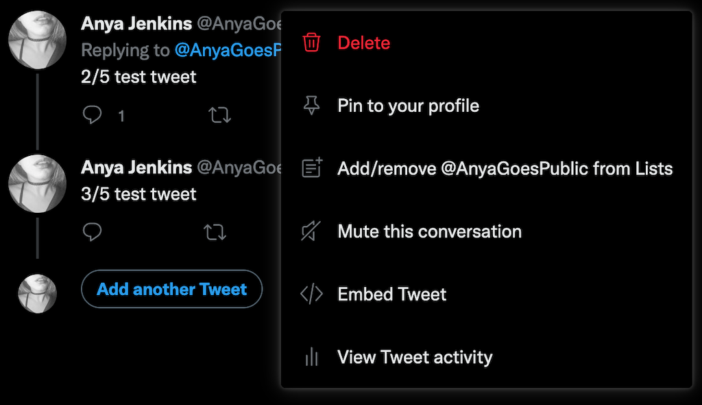 Вы можете добавить больше твитов после публикации темы. Для этого откройте любой отдельный твит в своей ветке, прокрутите вниз и выберите Добавить другой твит.