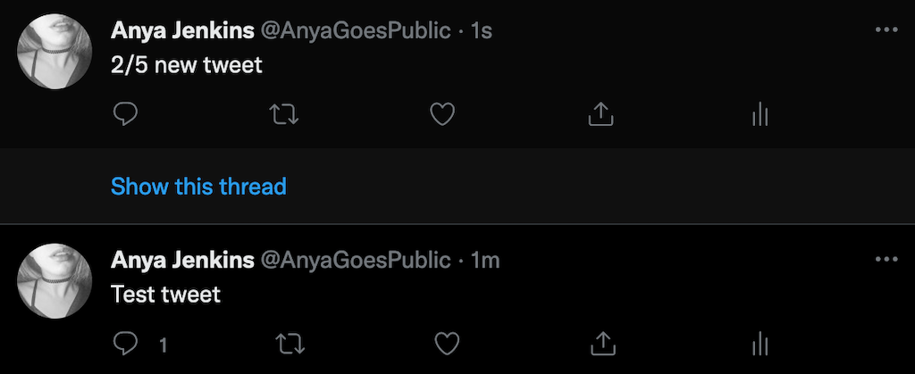 Теперь рядом со вторым твитом появится сообщение « Показать эту ветку». Вы можете продолжать публиковать новые твиты, используя функцию «Ответить», пока не дойдете до последнего твита в вашей ветке.