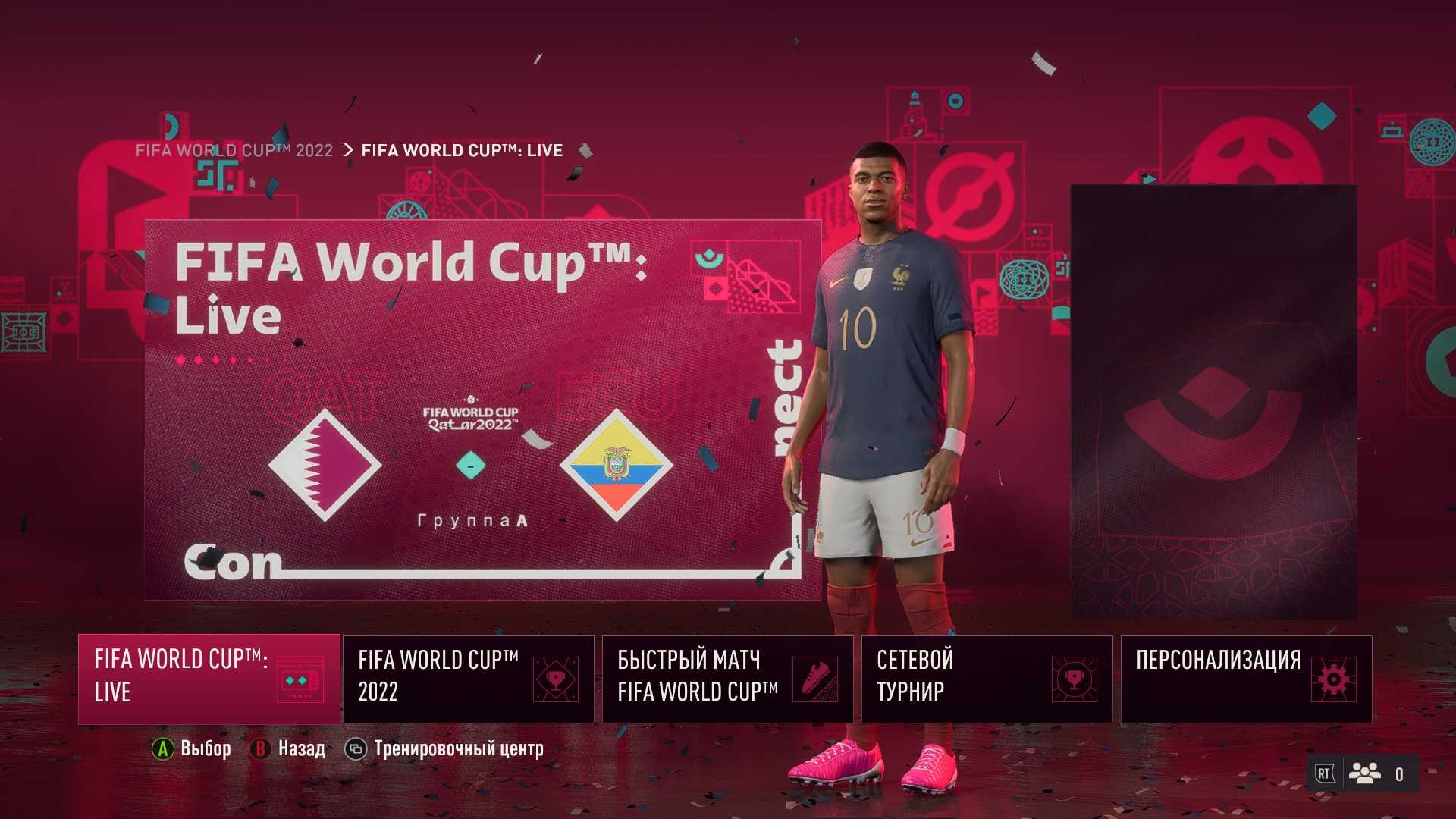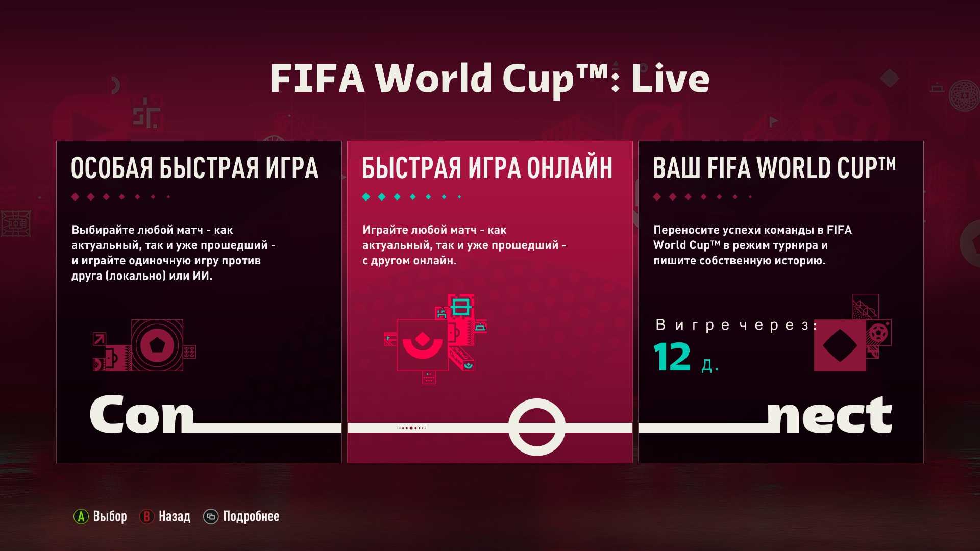 В дополнении появилось сразу четыре режима игры: live, одиночный Кубок мира, быстрый матч и сетевой турнир. Лайв-матчи сосредоточены вокруг реальных противостояний ЧМ-2022. Здесь доступны игры против ИИ, локальные и онлайн-матчи с друзьями. Самый интересный режим лайва – «Ваш FIFA World Cup» с выбором любого момента чемпионата мира для старта одиночного турнира. Разработчики заверяют, что в нем появятся актуальные составы. Режим откроется после первого матча ЧМ-2022.