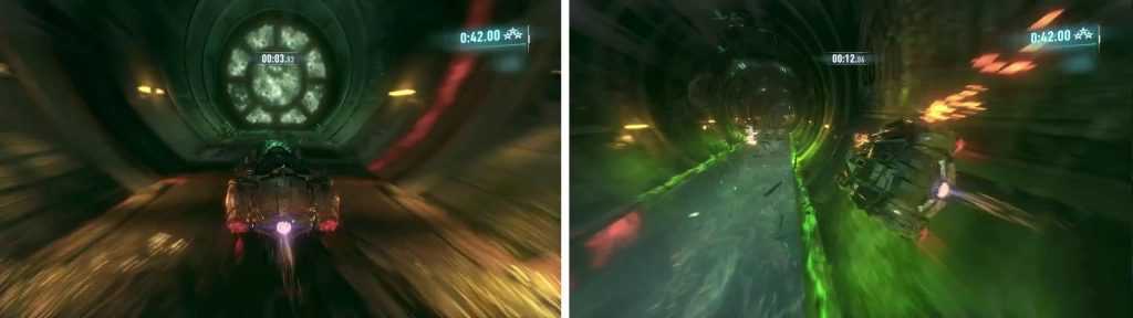По сути, чтобы завершить эту головоломку, вам нужно влететь в три большие светящиеся панели, которые можно найти на стенах по всей комнате. Чтобы сделать это с достаточной скоростью, чтобы поразить их давлением, вам нужно разбежаться на бэтмобиле по небольшой прямой дороге и катапультироваться в скольжение.