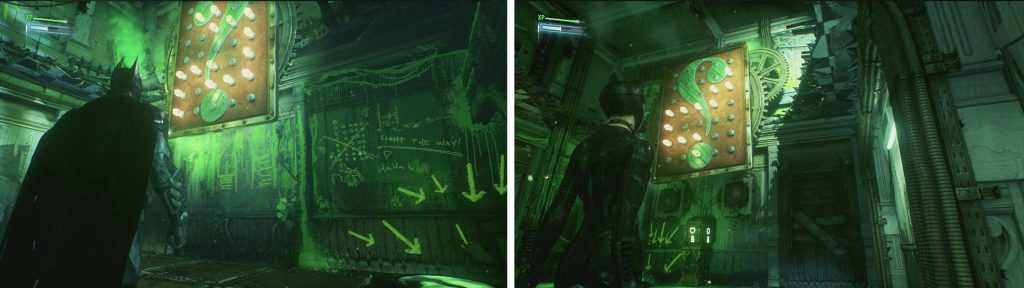 После краткого монолога Загадочника нажимная пластина на полу здесь станет активной. Займись этим вместе с Бэтменом. Это позволит опустить решетку у потолка. Переключитесь на Женщину-кошку и попросите ее проползти по потолку, через новое отверстие и спуститься с другой стороны. Наступите на вторую нажимную пластину здесь, чтобы начать следующую головоломку.