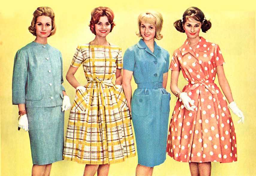 После войны (50-70-е) стало модно быть женственной. Девушки носили длинные платья и юбки, обильно декорированные блузки. Из трендов можно отметить рукава-«фонарики», юбки-клеш или в складку, объемные плечи, подчеркивающие талию пояса.