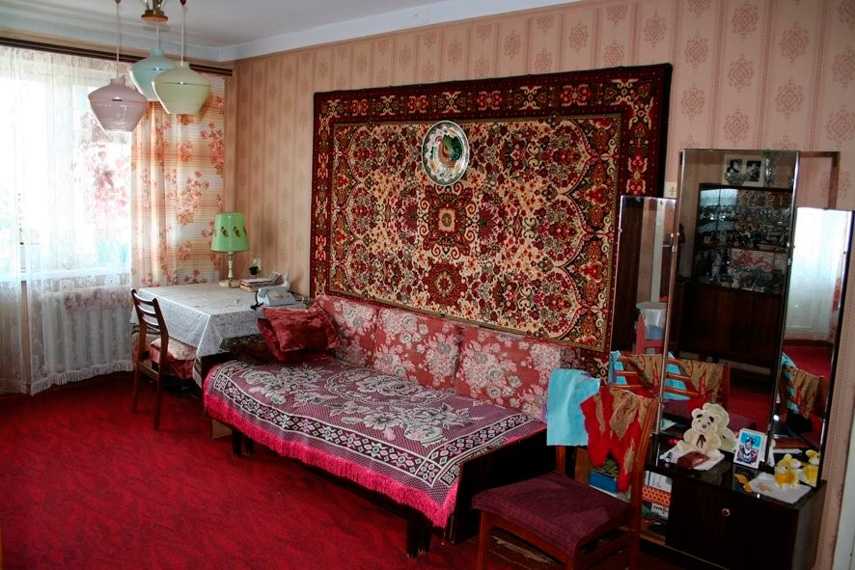 Практически обязательные атрибуты советской эпохи – ковры на стенах, сервант с хрустальной посудой, торшеры или лампы с абажурами. Из «предметов роскоши» – дисковый телефон, патефон.