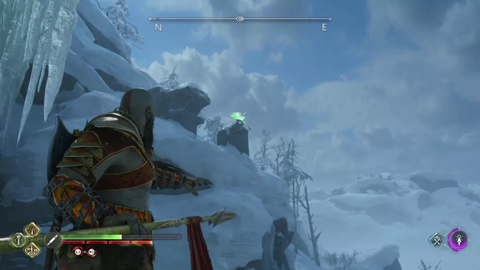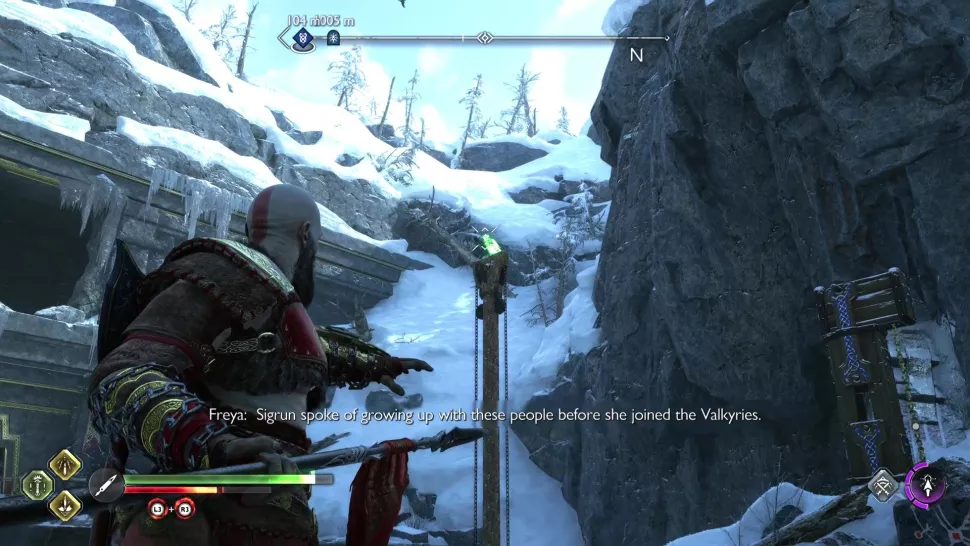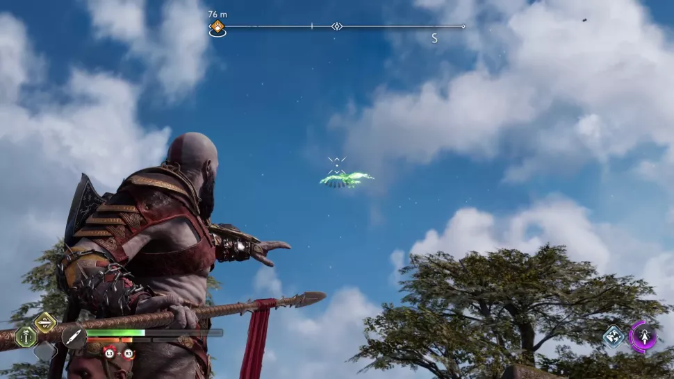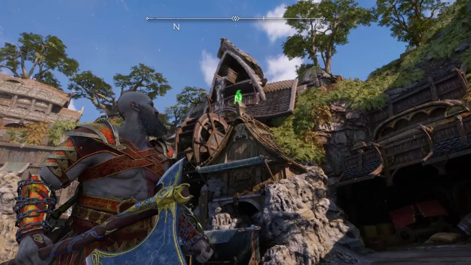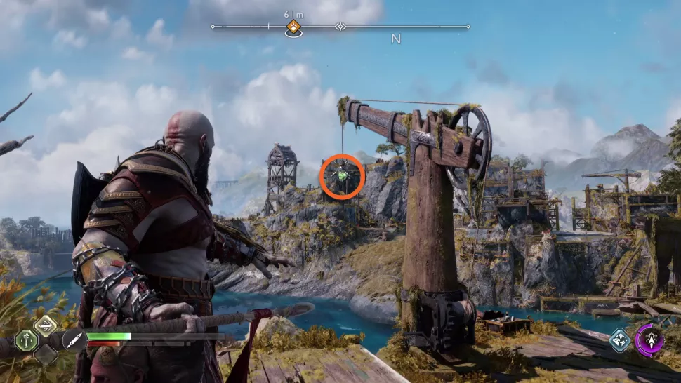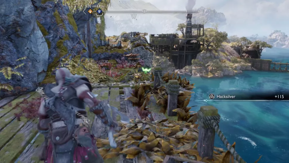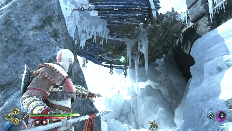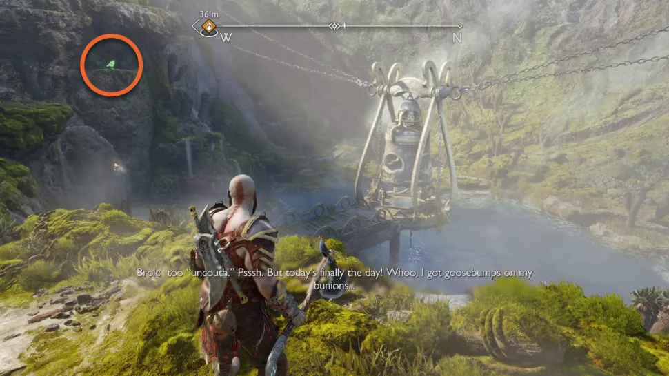 Пока вы прокладываете свой путь через Applecore, вы в конечном итоге достигнете головоломки, в которой вам нужно заморозить водные каналы с помощью топора и заставить Атрея стрелять звуковыми кусками руды, чтобы пройти через область на движущейся платформе. Как только вы сойдете с движущейся платформы, посмотрите налево, и вы увидите Ворона, сидящего на стропиле.