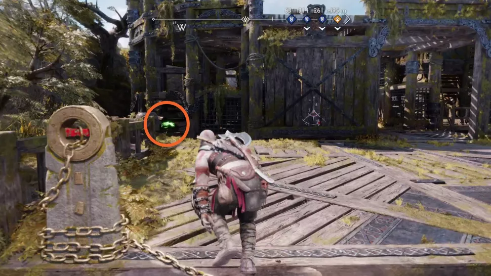 Затем возьмите второй кристалл и используйте его, чтобы освободить мост. Сначала удалите смолу с самого пирса, а затем на балконе, где она застревает. Идя по пирсу, посмотрите направо и вы заметите второй символ саркофага — уничтожьте его. С другой стороны платформы поднимите ее лебедкой, заблокируйте топором и войдите в верхнюю часть камеры. Там вы найдете саркофаг и последний глиф. Уничтожьте его и вернитесь, чтобы получить содержимое запечатанного сундука ( яблоко идуна ). Как только вы его получите, возьмите еще один взрывающийся кристалл — за мостом справа есть табличка, которую Атрей сможет прочитать.