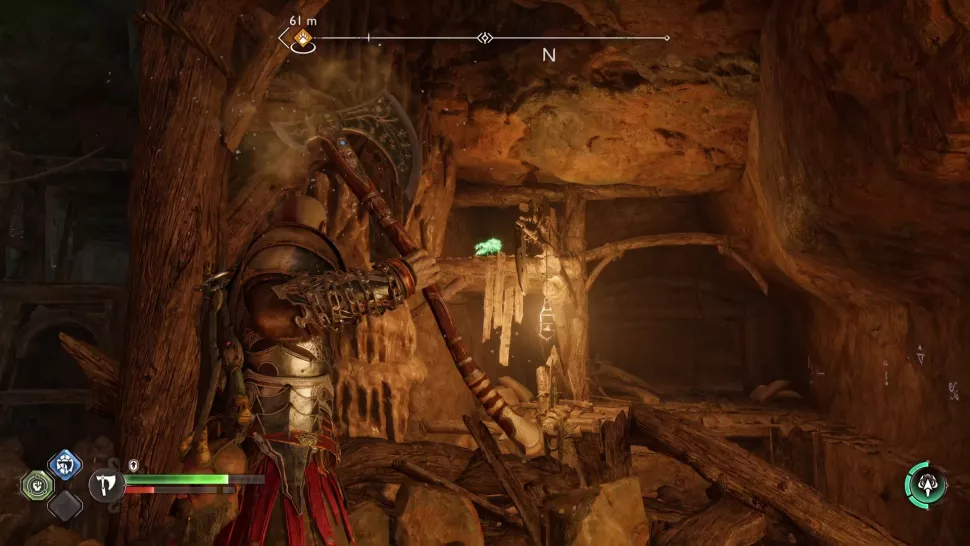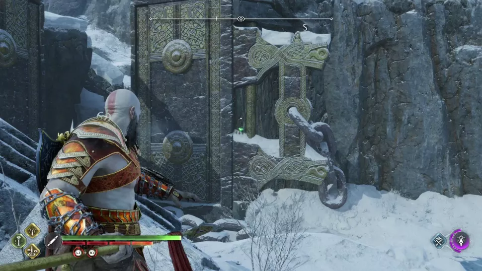 На пути через следующий туннель сразитесь с врагами, которых встретите. Наконец, вы доберетесь до большой комнаты с пирсом, сундуком Норн и взрывающимся кристаллом. Сначала возьмите кристалл, вернитесь немного назад и откройте запертый смолой проход. Благодаря этому вы найдете алтарь йотунов , а также первый символ саркофага — слева, на скале.