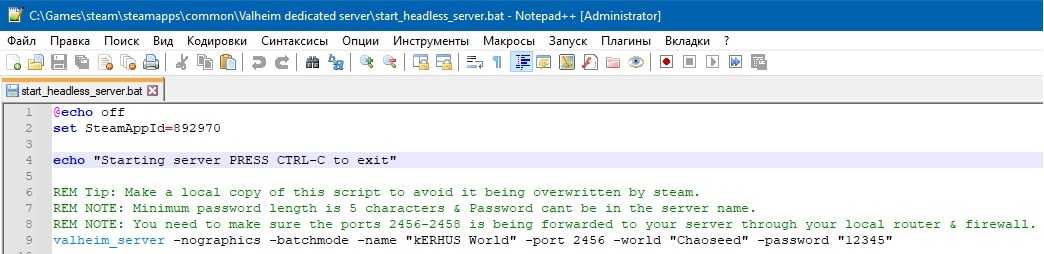 Текст в файле должен выглядеть как-то так: «start valheim_server -nographics -batchmode -name X -port 2456 -world X -password X -public 1». Как можно догадаться, сейчас мы будем редактировать недостающие X.