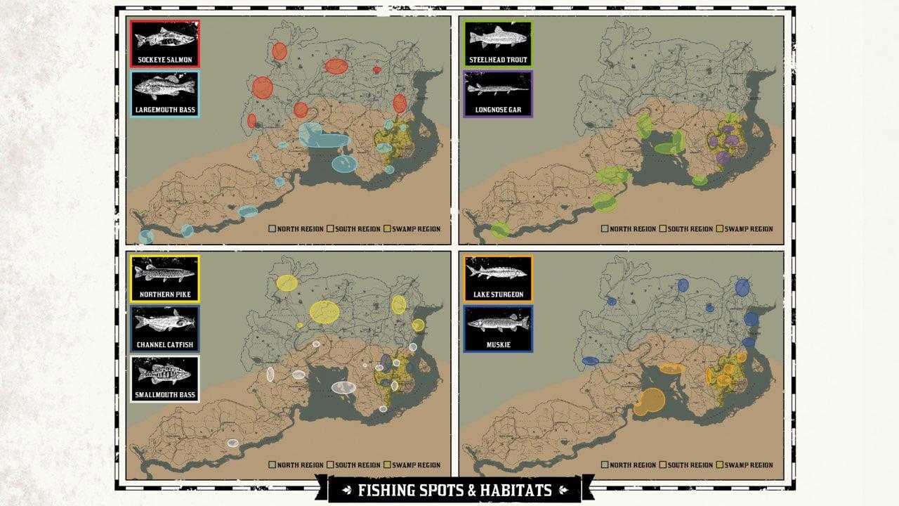Вот список видов рыбы в привязке к местам и времени активности, а также наилучшей приманке: