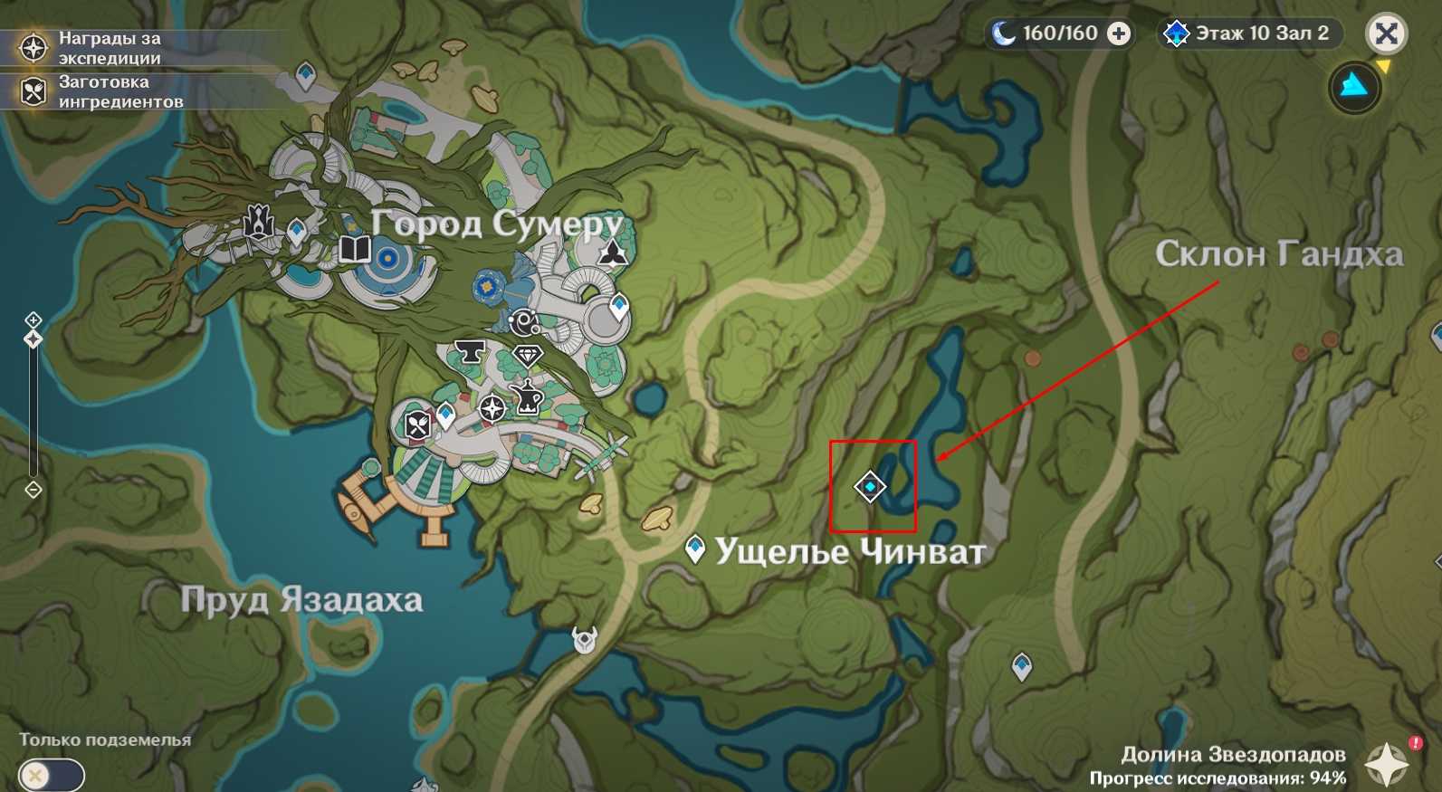 Если вы не знаете, где найти Сказителя в Genshin Impact, посмотрите изображение ниже. На нем отмечено местоположение входа в подземелье Мастерская Дзёрури и самого босса в Сумеру. Чтобы попасть к Скарамучче, используйте ближайший к Ущелью Чинват телепорт или доберитесь до него из столицы региона.