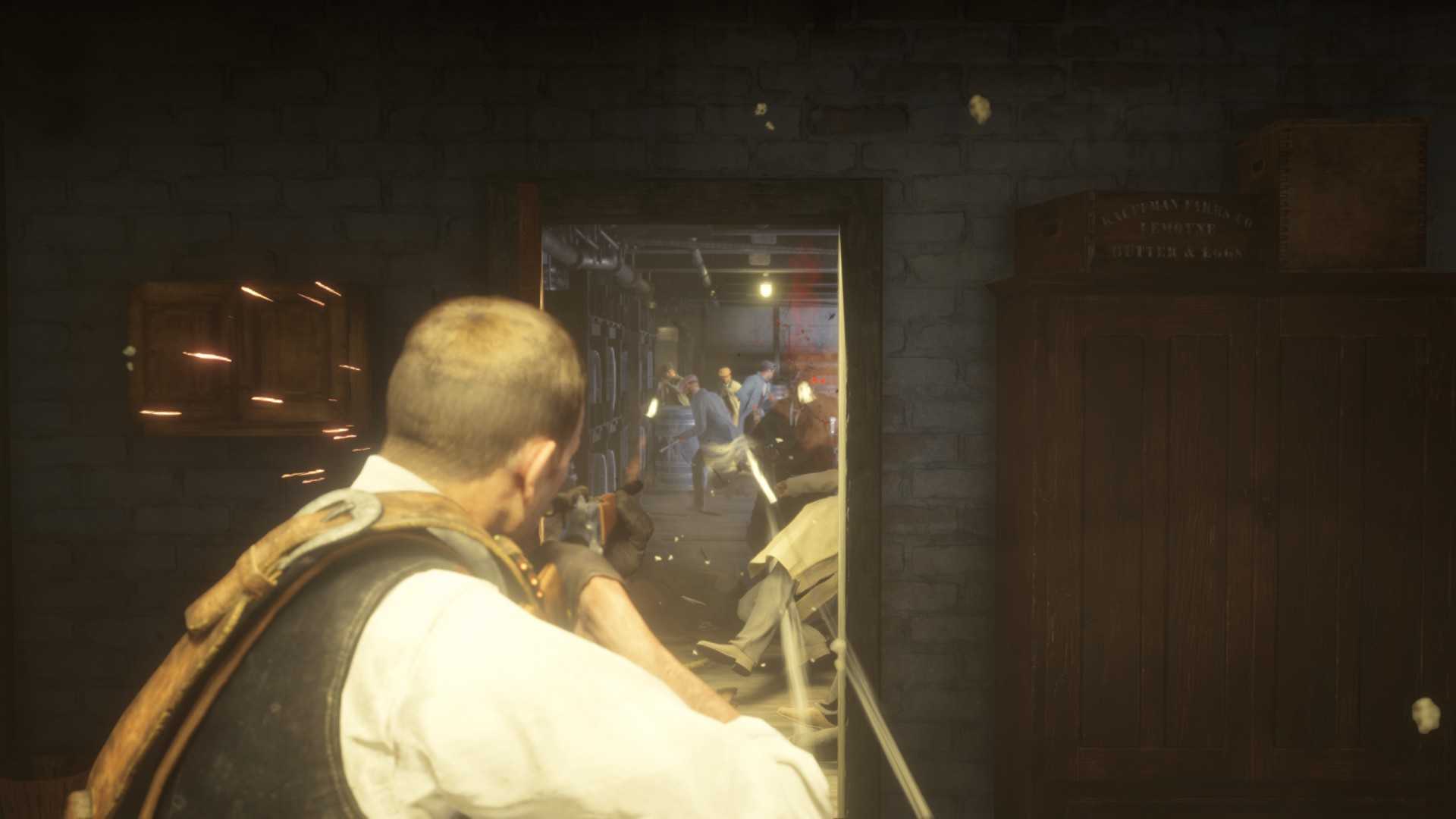 Теперь нам нужно активировать «Меткий глаз» – жмем на R2 и ждем, пока шкала не заполнится наполовину. Потом целимся в недотепу и стреляем. И сделать это нужно первым, иначе Эммет пристрелит Артура с первого выстрела. После того, как Артур расправится со скрягой, нужно взять фотоаппарат и сфотографировать его остывающее тело.