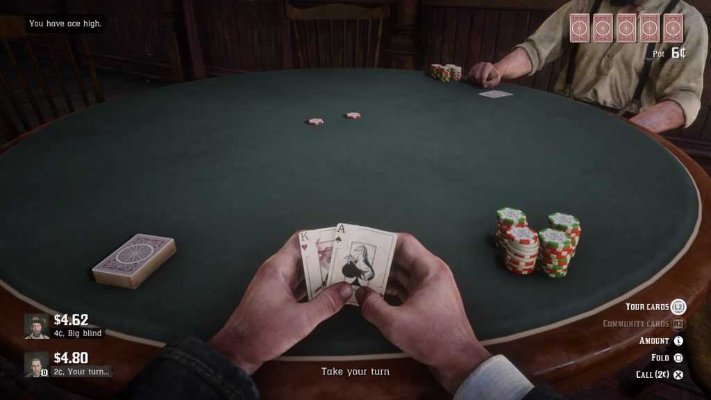 В барах Red Dead Redemption можно поиграть в техасский холдем, где каждый игрок начинает с двух карт. После раунда торговли на стол выкладываются три общие карты, которые может использовать каждый. После еще двух раундов торговли на стол выкладываются еще две карты, и затем вам нужно собрать наилучшую комбинацию из пяти карт, используя семь карт (две карманные карты и пять общих).