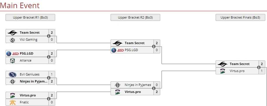 Virtus.pro пробилась в верхнюю сетку и осталась в ней после первого раунда. Серия до трёх побед с китайской LGD должна была стать захватывающим противоборством двух школ, но превратилась в лёгкую разминку для российской команды. Оба матча продлились меньше 30 минут и закончились с разгромным счётом по убийствам — 26:5 и 24:8. Достаточно красноречивым является факт, что керри Virtus.pro Роман Ramzes666 Кушнарёв ни разу не умер на протяжении двух игр и убил 14 противников, а его визави Ван Ame Чуньюй отличился лишь в трёх драках.