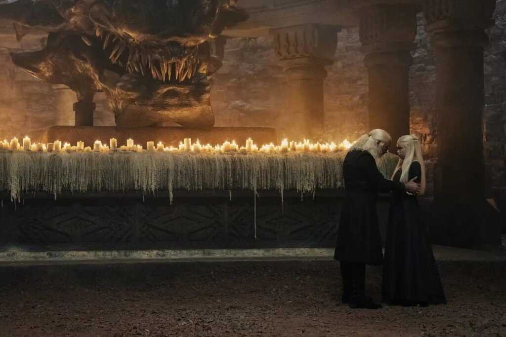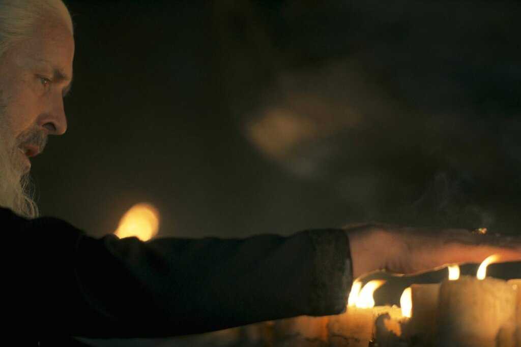 Визерис неестественно долго держит руку над пламенем свечей, что может быть намеком на дискуссии о том, подвержены ли Таргариены воздействию от огня.