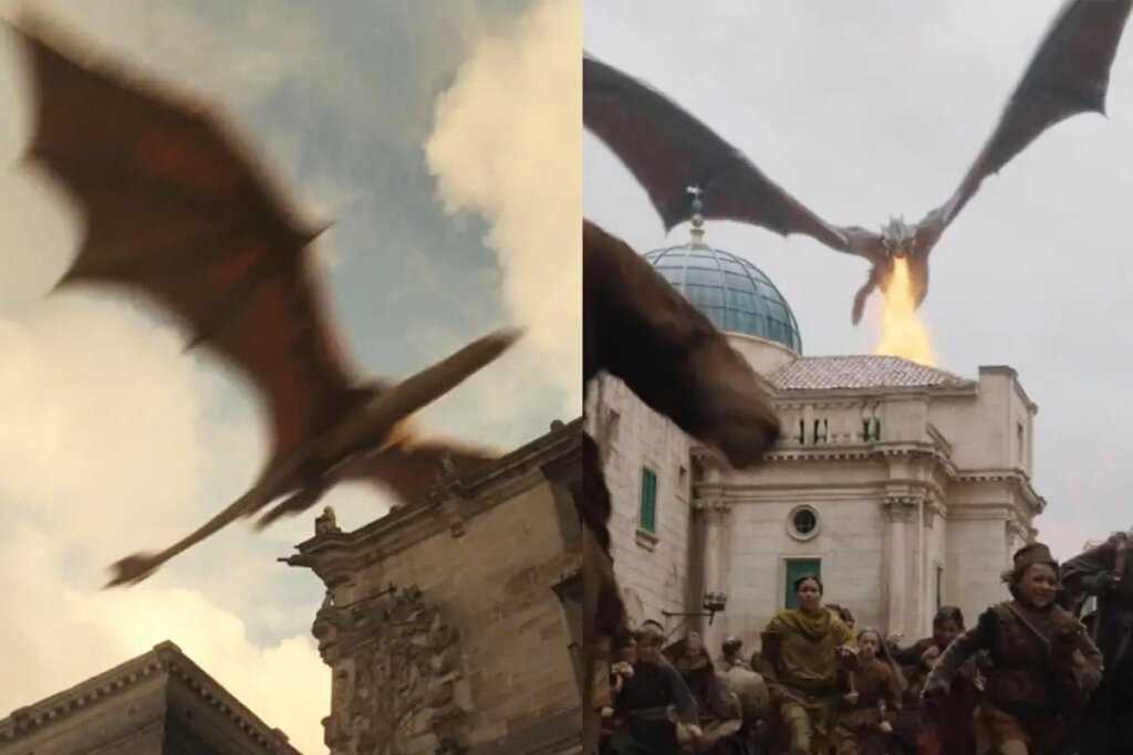 Первое, что мы видим после пролога, это Рейнира, летящая на своем драконе Сираксе над Королевской Гаванью. Здесь очевидна прямая визуальная параллель со сценой из эпизода «Колокола», в котором Дейнерис разрушает город.
