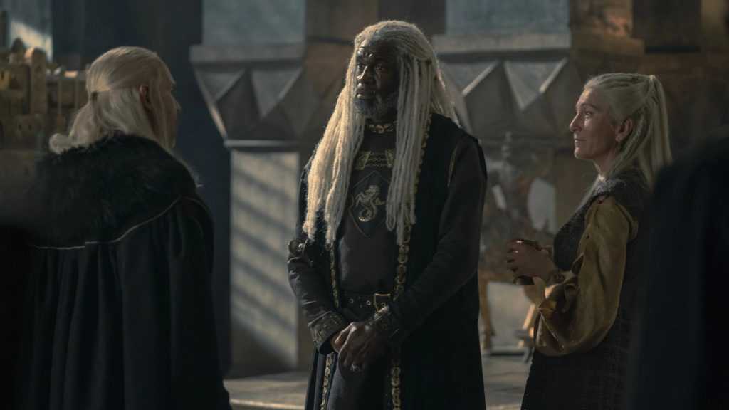 Тут же в игру вступает отпрыск Лионеля — Ларис (Мэттью Нихэм), который недвусмысленно даёт понять королеве Алисенте, что её отец не был далёк от правды, а сама Рейнира очевидно обманула подругу. Чтобы убедиться в этом самой, Алисента приглашает в свои покои сира Кристона и спрашивает у того, что же на самом деле случилось в злополучную ночь, когда принцесса отлучалась из замка. Наш бравый рыцарь не юлит и честно признаётся, что обесчестил себя (ну и Рейниру, соответственно) и готов принять смертельное наказание. Эта информация в корне меняет ситуацию и настрой Алисенты, которая теперь должна полноправно включиться в «игру престолов».