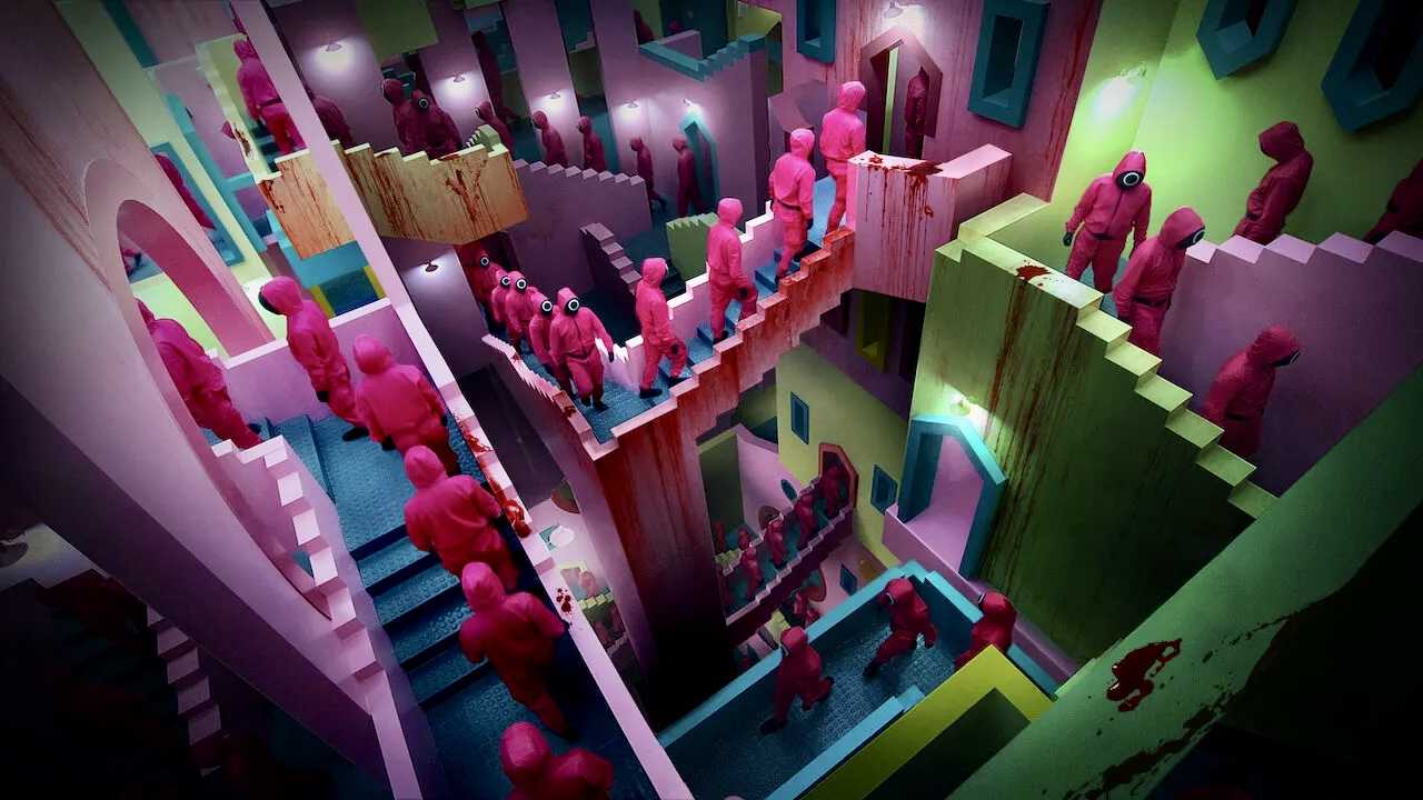 На острове, куда привезли всех участников, сконструирован отдельный бункер. Там настоящее буйство красок: зефирно-розовые лестницы, зеленые униформы игроков, красные робы охранников, голубые облака на стенах, гигантская оранжевая кукла, которая стреляет глазами, золотые маски богачей, наблюдающих за играми. Каждая игра словно проходит на детской площадке, да и сами взрослые кажутся там детьми — горки и карусели увеличены в размерах.
