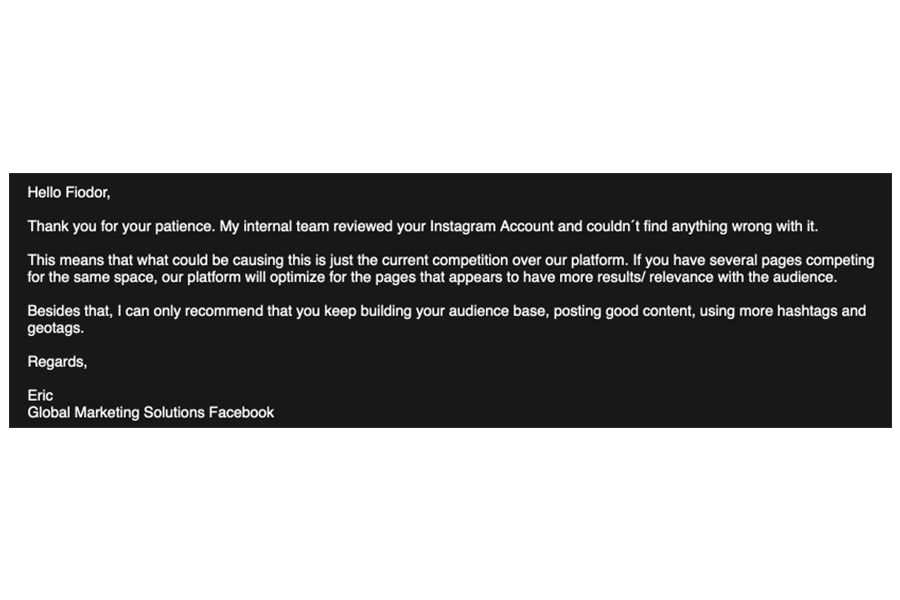 Ну и на сладкое — совет от самих специалистов Фейсбука* и Инстаграма* аккаунту, на который наложен алгоритм теневого бана, из-за которого и было обращение в поддержку. Кроме того активно используется мф/мл и постинг.