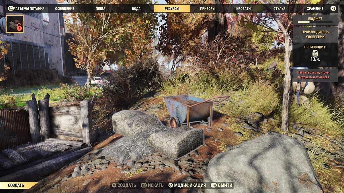Тут Bethesda пошла навстречу: добавила станции производства ресурсов, которые дают каждые пару часов определённый материал. Это позволяет не рыскать по фермам и сараям в поисках, например, мешка удобрения.