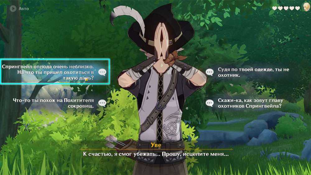 Барбара залечивает ваши раны, но тут подбегает подозрительный незнакомец и просит его вылечить. Говорим ему «Спрингвейл отсюда очень неблизко. На что ты пришел охотиться в такую даль?»: