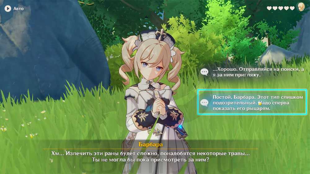Барбара хочет уйти за травами, чтобы вылечить его. Но ответьте ей «Постой, Барбара. Этот тип слишком подозрительный. Надо сперва показать его рыцарям»: