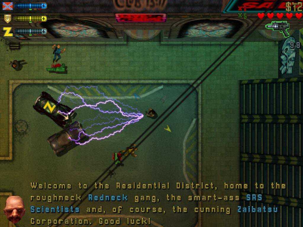 В DMA Design выкрутили градус безумия на полную катушку! Мафиози давали криповые задания вроде «уничтожь лекарство от безумия», а диджеи орали в микрофон и несли околесицу. Местные банды – не только русская мафия, но и натуральный сброд типа сбежавших обитателей психушки, безумных ученых или реднеков. В городе можно найти жетоны безумия, с которыми вы впадали в режим буйства и косили людей за милую душу. И все ради новой пушки.