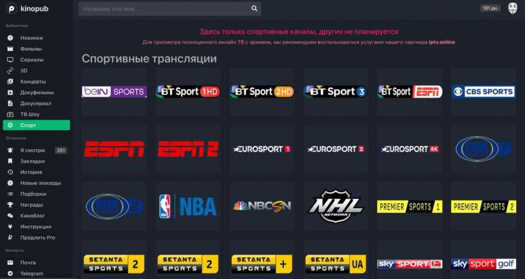 6. После оплаты и активации про-аккаунта (может занять какое-то время) идем на вкладку «спорт». Здесь более 40 основных спортивных каналов со всего мира – в том числе транслирующие АПЛ и Лигу 1. Ура!