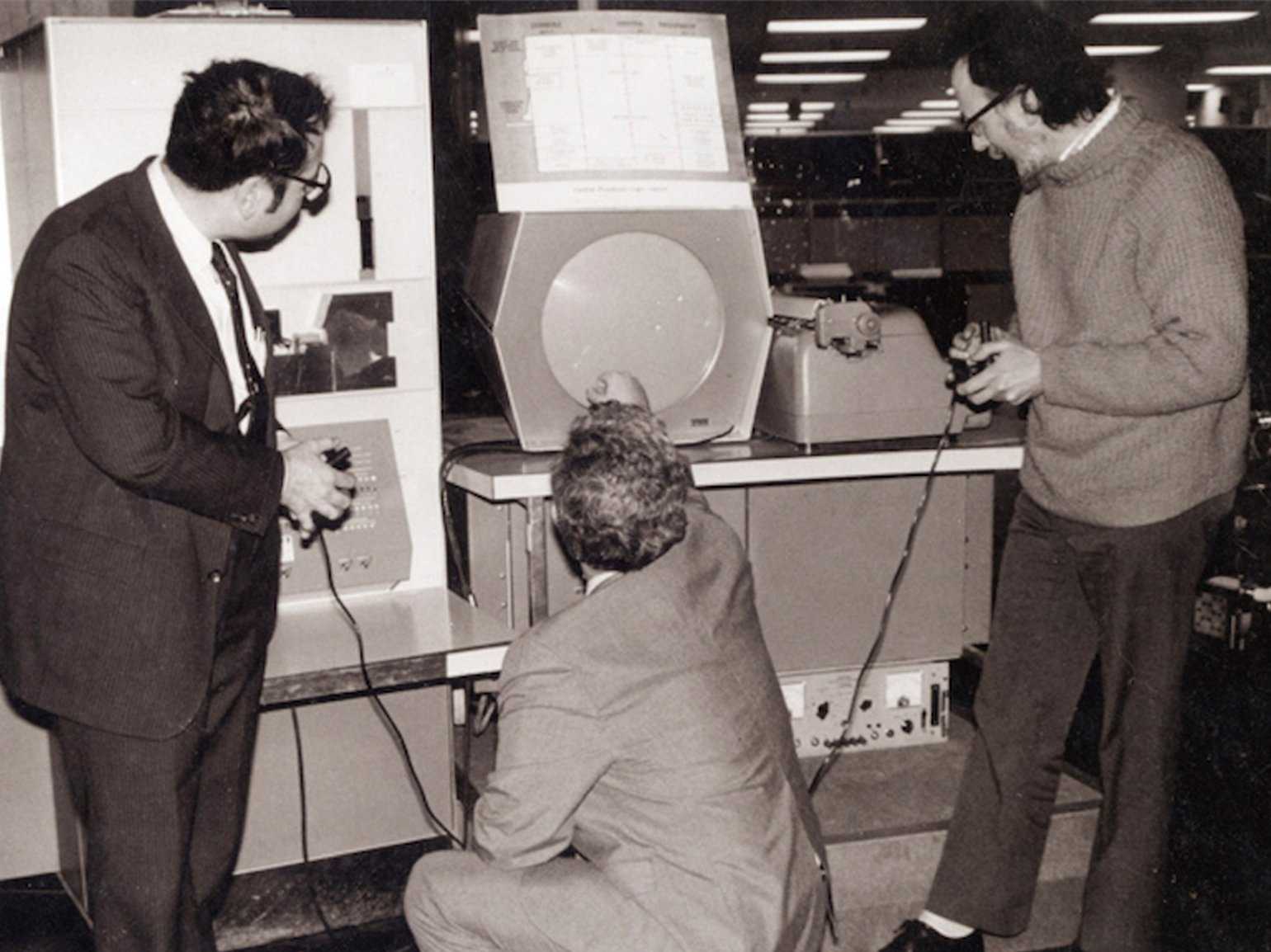Алан Коток, Стив Рассел и Мартин Грец играют в Spacewar! в Бостонском компьютерном музее. Фото: Computer History Museum