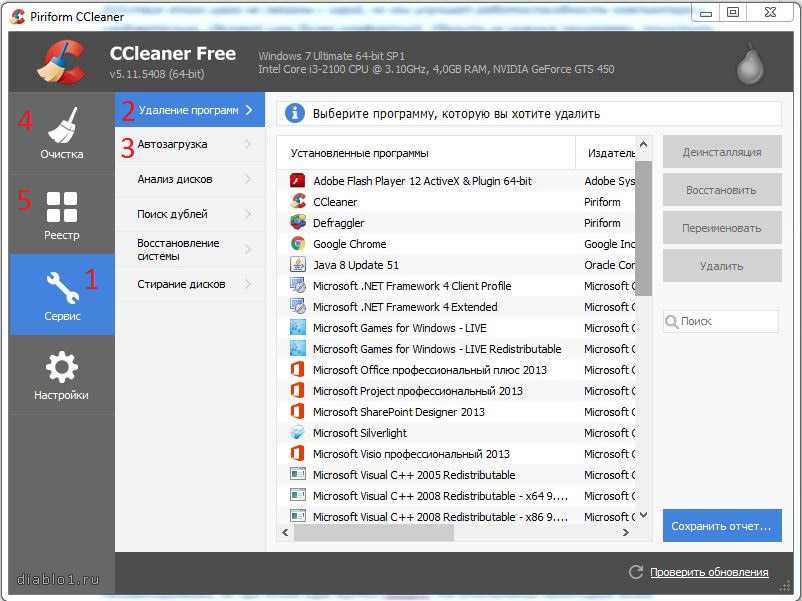 окне CCleaner выберите Сервис (1) и Удаление программ (2). Затем уменьшите количество автоматически запускающихся программ в окне Автозагрузка