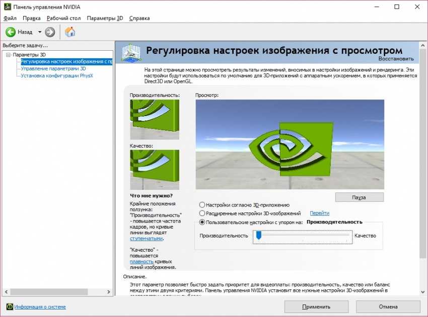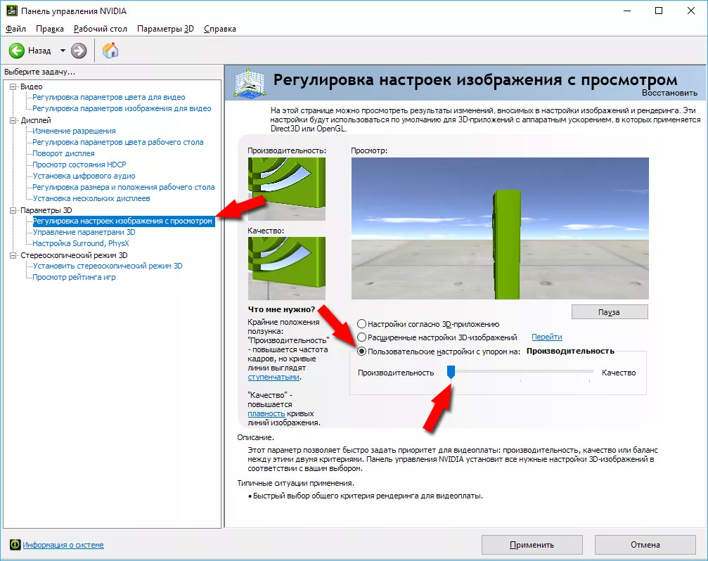 Говорят, также повышает FPS почти в любом случае.Настройка для видеокарт NVIDIA Сделайте как показано на скриншоте, в Панели управления NVIDIA во вкладке «регулировка настроек изображения» поставьте ползунок ближе к «Производительность».