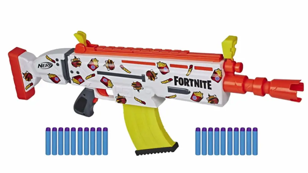 Соответствуя игре, бластер имеет яркий дизайн пушки из «Королевской битвы» (поймут только игроки Fortnite). Создатели подарили оружию особый механизм, ускоряющий пули при стрельбе. магазин на 10 зарядов.