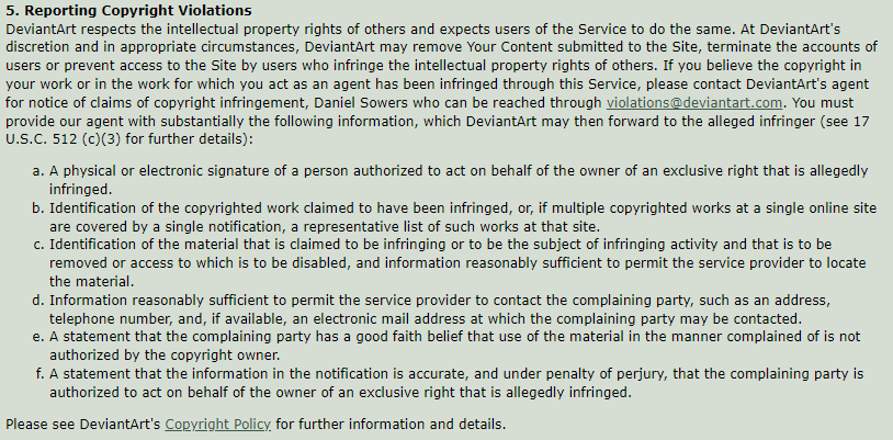 У DeviantArt есть условия предоставления услуг, которые содержат нарушения авторских прав и некоторые правила конфиденциальности. Вы можете быстро ознакомиться с Условиями обслуживания, чтобы подробно ознакомиться с правилами.