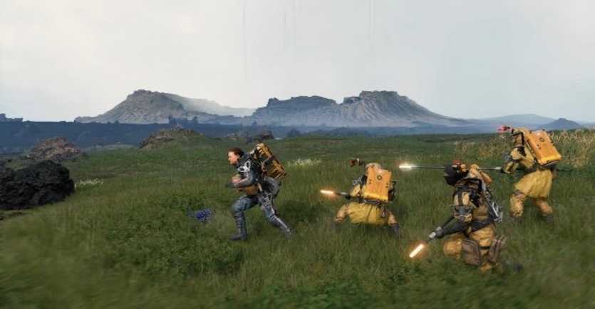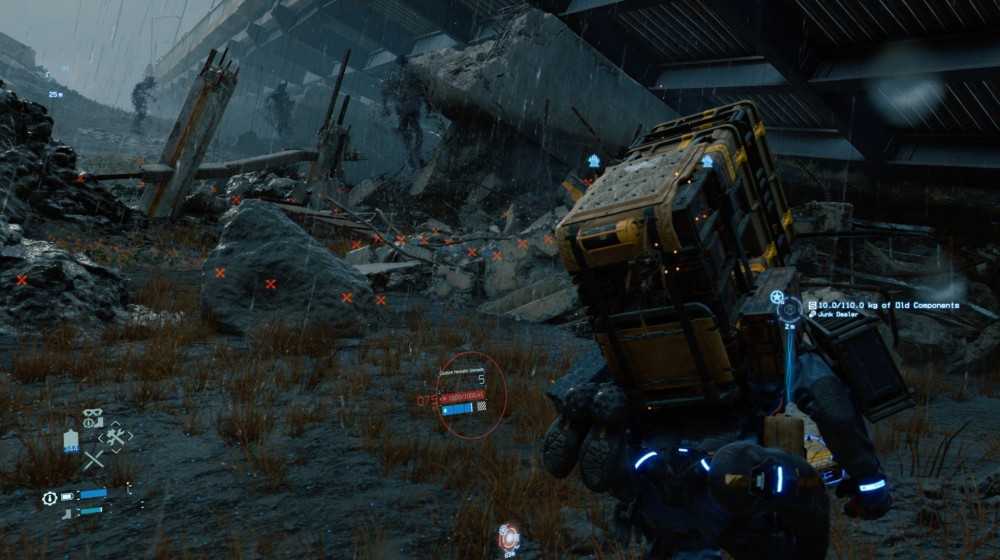 Элементы более традиционного геймплея тоже присутствуют – экшен Death Stranding вполне похож на другие игры жанра и даже Metal Gear Solid V. Сэм использует огнестрельное и электрическое оружие, гранаты, оружие ближнего боя и даже ножные экзоскелеты, значительно повышающие скорость бега и дальность прыжков. В игре можно захватывать вражеские лагери, причем при желании это можно делать скрытно, вырубая противников со спины удавкой героя. Кроме того, Сэм может пользоваться транспортом: угонять грузовики врагов, кататься на собственном мотоцикле или парить на летающей грузовой тележке (которая в первую очередь все-таки используется в качестве дополнительного инвентаря).