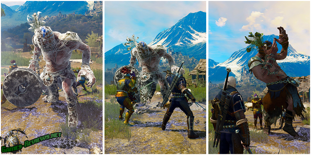 Итак, что же можно сказать о данном противнике? Во-первых, его зовут Голиаф и он первый босс дополнения «Кровь и вино». Да-да, не удивляйтесь, тут действительно придётся сражаться с боссом уже через минуту после прибытия в Туссент. Во-вторых, в качестве оружия он использует мельничный жернов, заменяющий дубину и значительно превосходящий обычное вооружение гигантов. Наконец, Голиаф — это великан, а значит, он уязвим для масла против огров, нанесённого на серебряный меч, неповоротлив и очень силён. С самого начала боя у Голиафа будет отсутствовать примерно девятая часть шкалы здоровья, но менее опасным противником он из-за этого не становится. Как бы странно это не звучало, но лучше всего подбежать к великану вплотную и рубить его мечом, откатываясь в сторону от его атак. Не помешает также наложить на себя защитный знак Квен, для большей уверенности в своей неприкосновенности. Он не отличается умом и сообразительностью, особой тактики против него использовать не стоит… Или стоит?